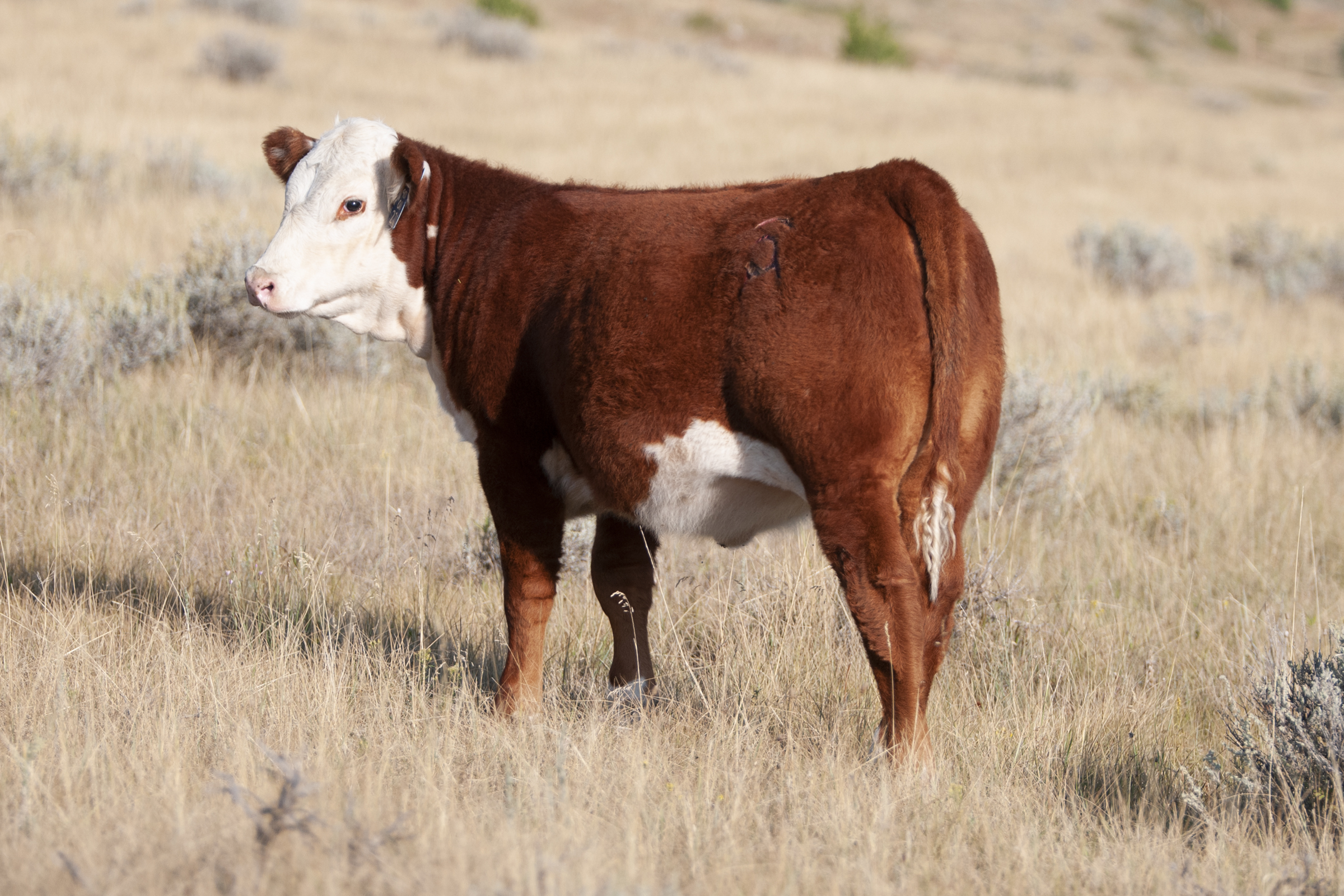 The maternal runs strong in this one. The Miss Wyo line consistently produces herd sires and hard working females for us year after year. Pretty from the get-go, she’s a spitting image of her dam at this stage and I don’t expect the similarities to change. Who wouldn’t want a pasture full of gorgeous 2 year olds that look like her momma here, backed by one hell of a cow family. Fancy enough to show, her real strength will shine long term as a productive female in the pasture.