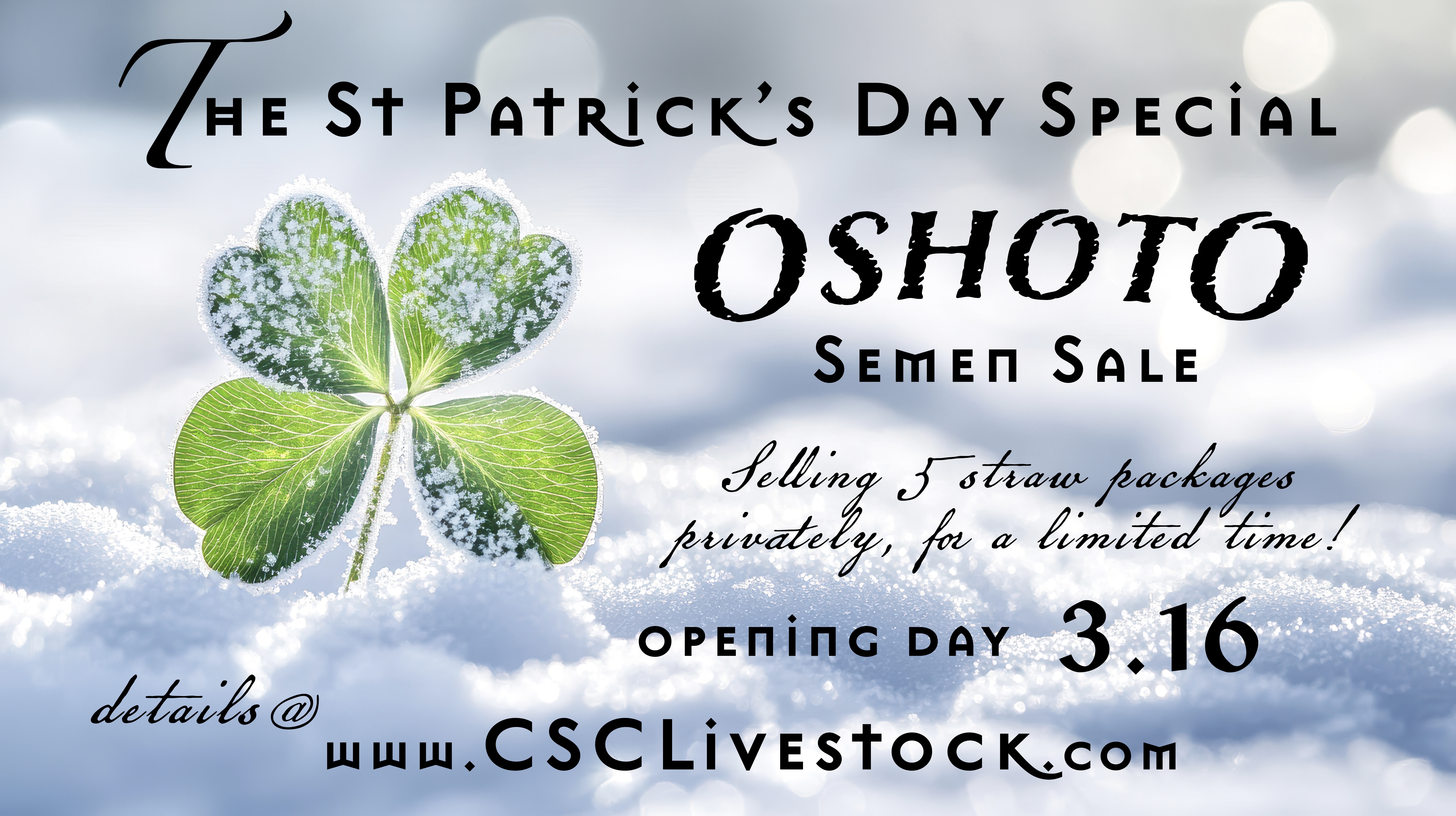 On Sunday, March 16th, we will begin selling conventional CSS qualified semen in 5 straw packages until March 27th. After that we close the tanks!!